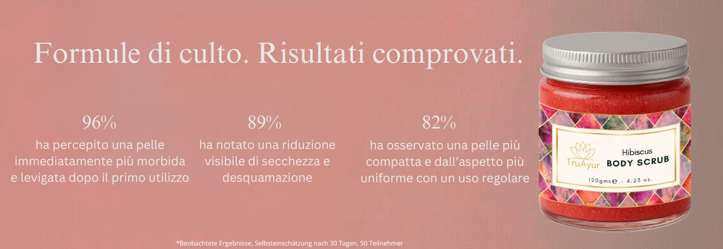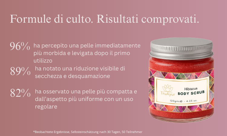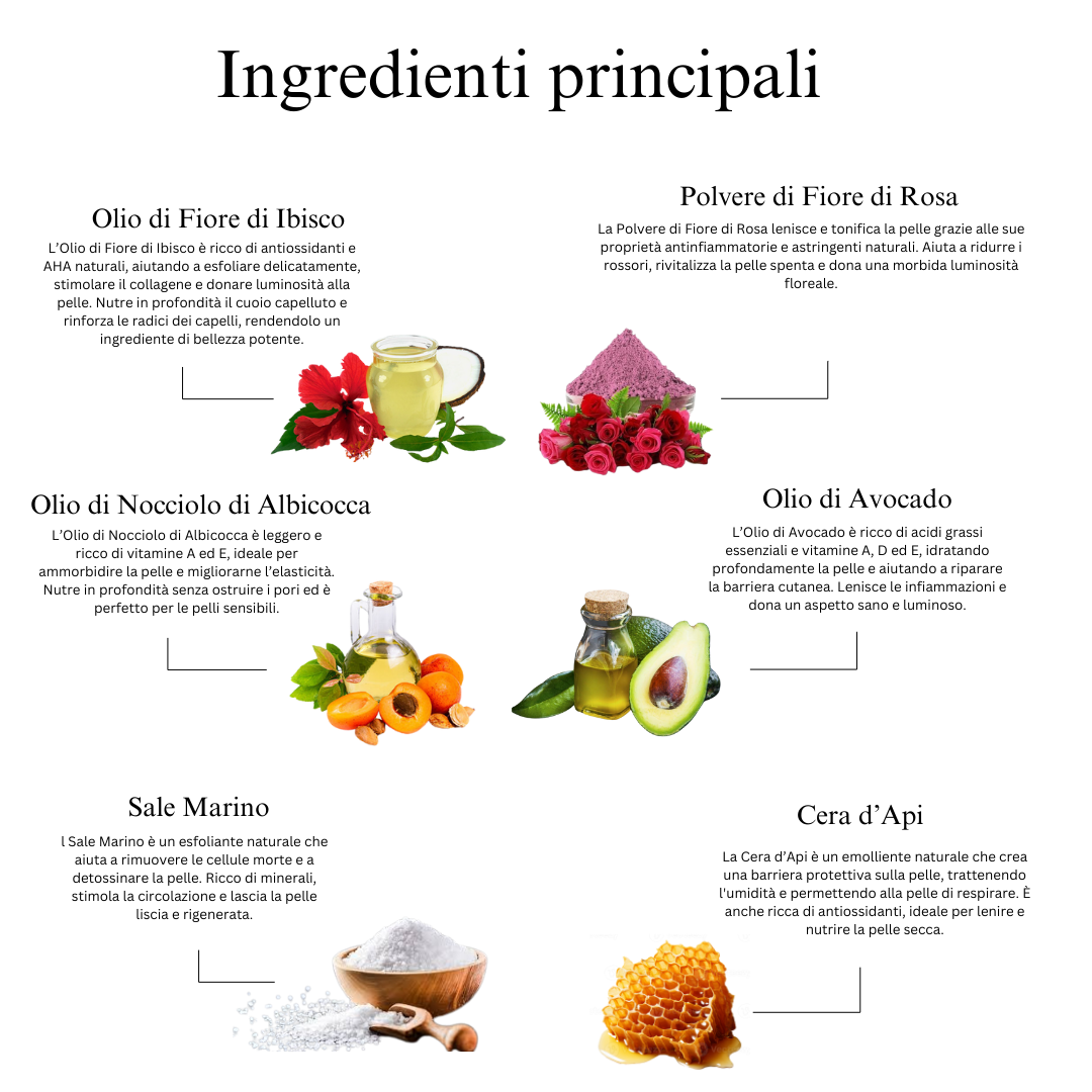 Il nostro Scrub corpo all'ibisco e rosa è molto più di una semplice esfoliazione: è una celebrazione della cura di sé ayurvedica. Radicato nell'antica tradizione dell'abhyanga (massaggio con olio) per tutto il corpo, questo scrub è realizzato per bilanciare l'esfoliazione con il nutrimento, aiutando a rinnovare sia la pelle che lo spirito.