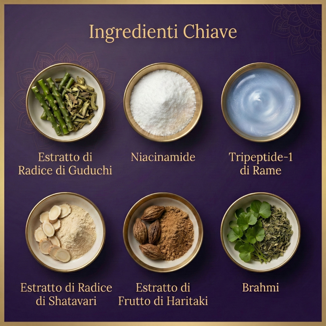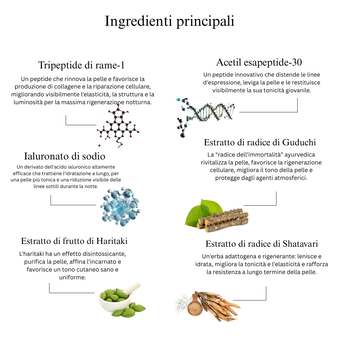 Il siero viso Night Repair è più di un semplice trattamento notturno: è un rituale rigenerante che combina l'antica arte curativa dell'Ayurveda con la moderna tecnologia dei peptidi. Basato su estratti vegetali tradizionali come guduchi, shatavari e brahmi, agisce in sinergia con principi attivi avanzati come il tripeptide-1 di rame e la niacinamide per restituire equilibrio, vitalità e luminosità giovanile alla pelle affaticata.